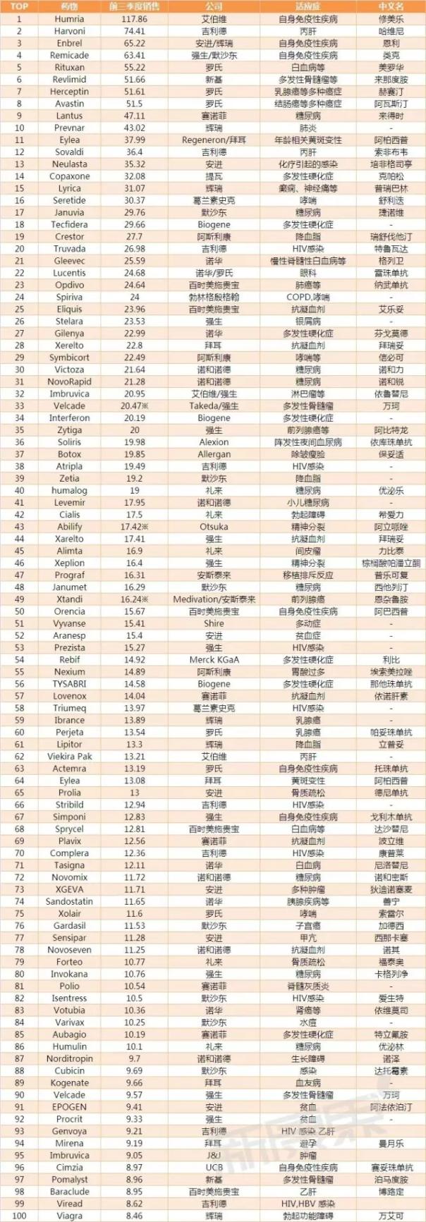 2016年第三季度全球藥物銷(xiāo)售額100強(qiáng)