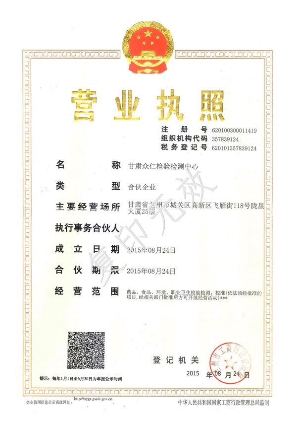 1.甘肅眾仁檢驗(yàn)檢測(cè)中心營(yíng)業(yè)執(zhí)照