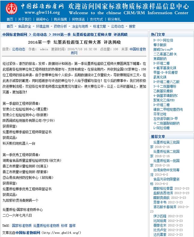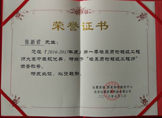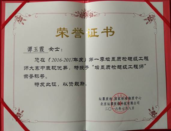 2016年7月,由壇墨質(zhì)檢-國家標(biāo)準(zhǔn)物質(zhì)中心舉辦的第一季超級工程師大賽,共有全國132家單位、158位工程師報(bào)名參加,最終評選出超級工程師3名、優(yōu)秀工程師4名,其中甘肅眾仁檢驗(yàn)檢測中心的譚玉霞、張新君表現(xiàn)優(yōu)異,被授予“壇墨質(zhì)檢超級工程師”榮譽(yù)稱號。