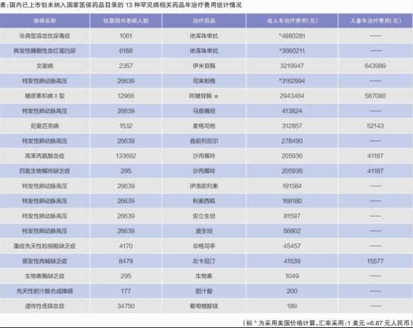 目前已經(jīng)在我國上市且有罕見病適應(yīng)證的55種藥品中,有29種藥品被納入國家醫(yī)保藥品目錄,涉及18種罕見病。這29種藥品中,有9種享受國家醫(yī)保藥品目錄甲類報(bào)銷,用于治療11種罕見病適應(yīng)證,患者使用時無需自負(fù)。但有26種藥品,涉及21種罕見病,尚未被納入國家醫(yī)保藥品目錄。其中,有13種罕見病涉及的所有治療藥品,均未被納入國家醫(yī)保藥品目錄,意味著這13種罕見病的患者必須自費(fèi)承擔(dān)全部的藥品治療費(fèi)用。在這13種罕見病的藥品治療花費(fèi)中,年治療費(fèi)用高的近500萬元,低的則僅需189元,中位值為20萬元。這13種罕見病在我國約影響23萬名患者,大部分人需要終生用藥治療。其中,有11 種藥品的治療費(fèi)用大于8萬元/年,在沒有醫(yī)保支付的情況下,患者難以維持長期足量和足療程的治療(見表)。